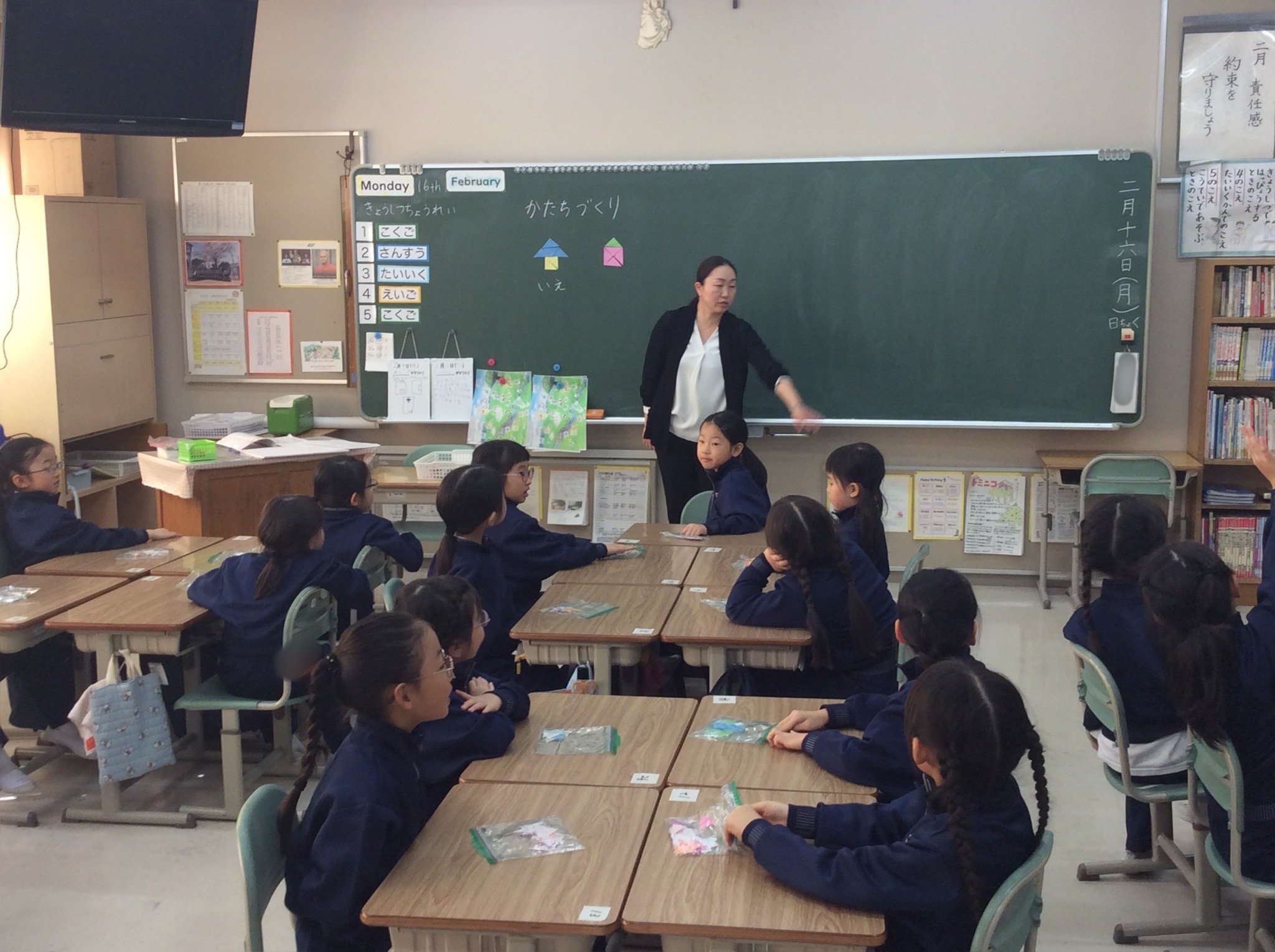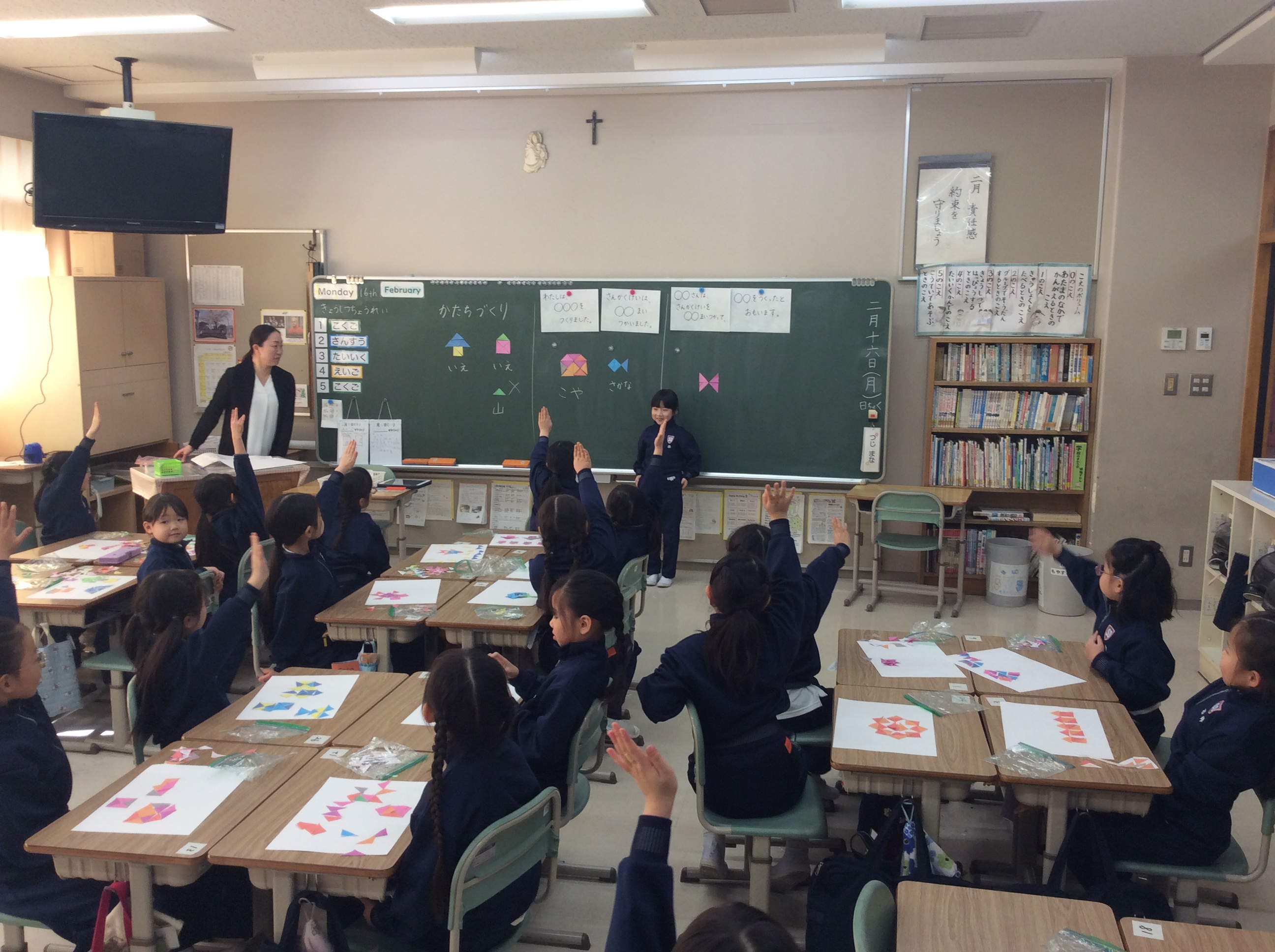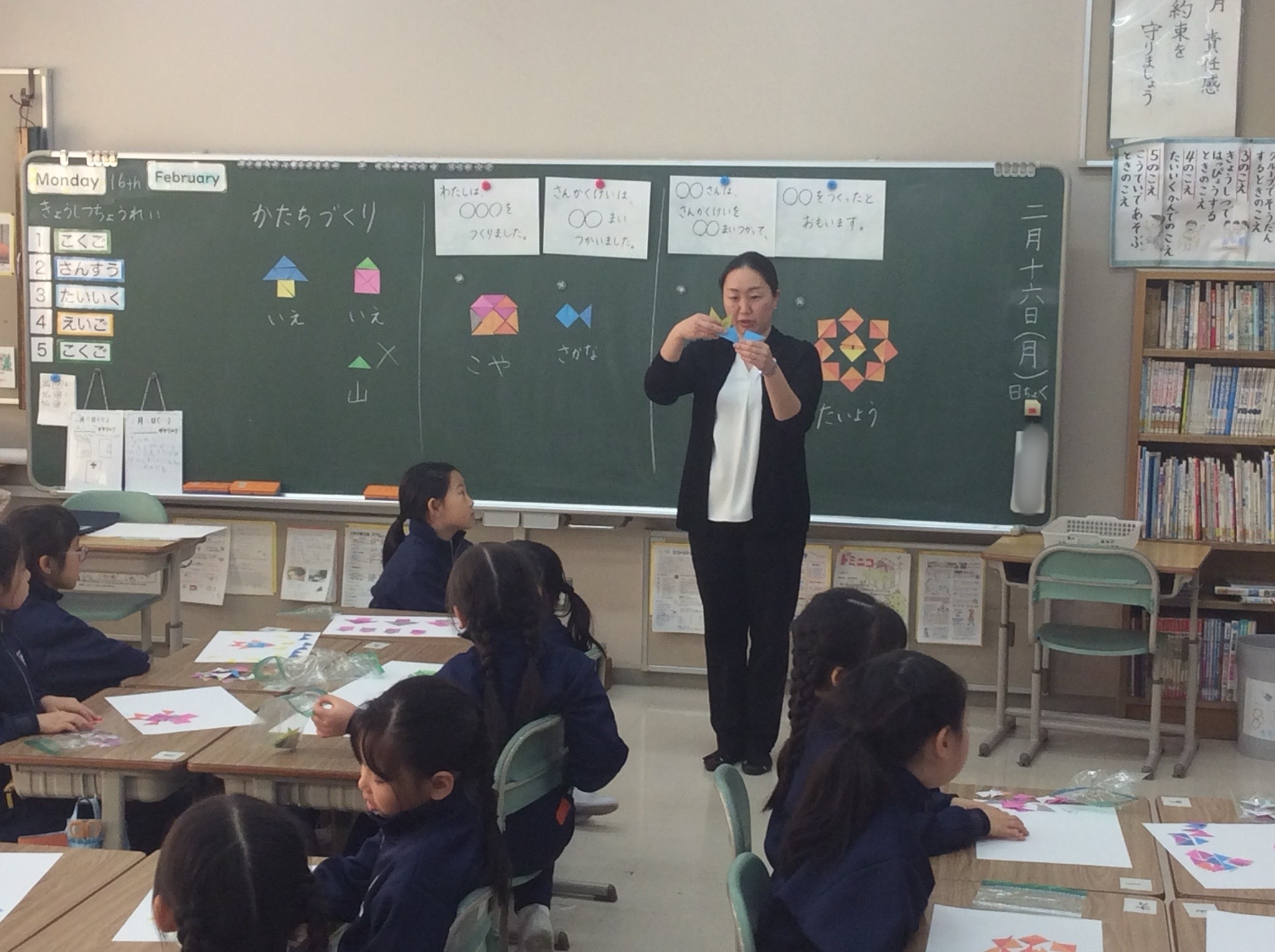この日、1年B組の2時間目は少し賑やかで楽し気な空気に包まれていました。授業科目は算数。子どもたちが楽しんでいたのは、自分が切り取った三角の色板で、思い思いの形をすきなように作っていたのです。