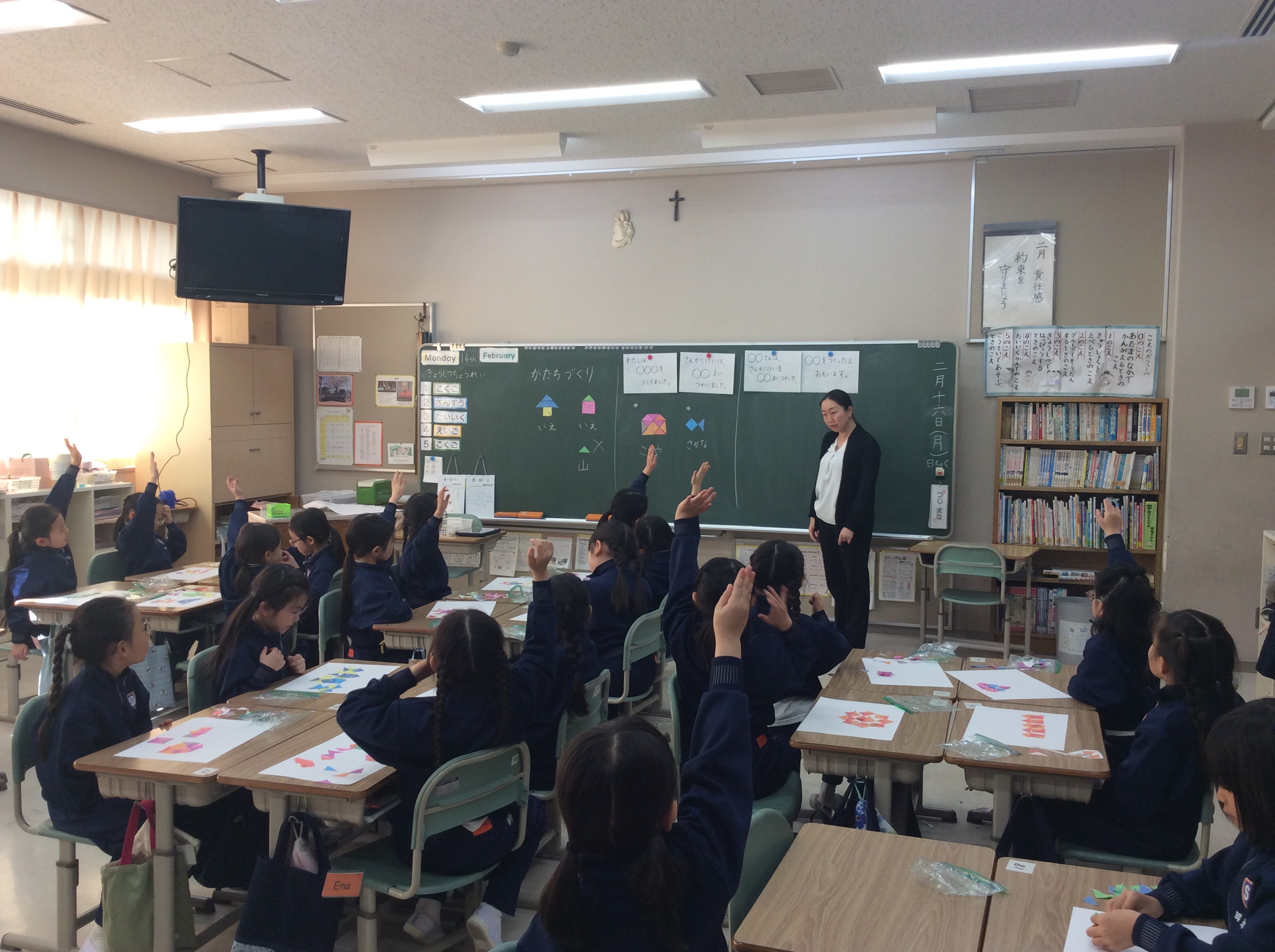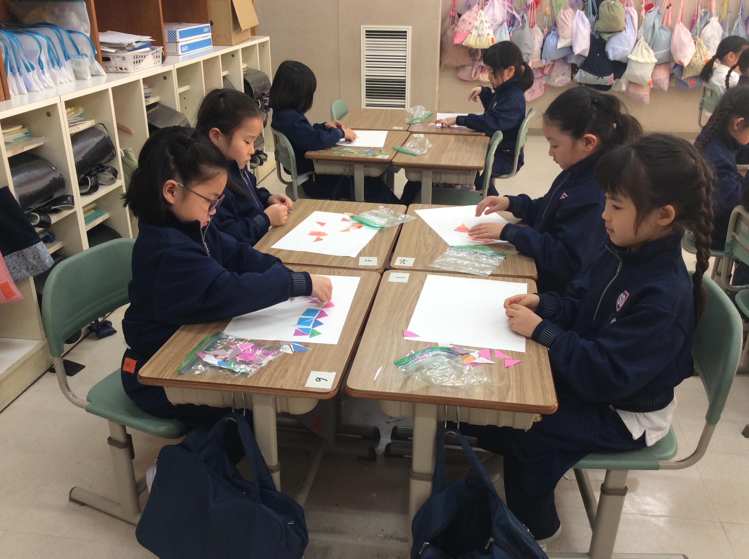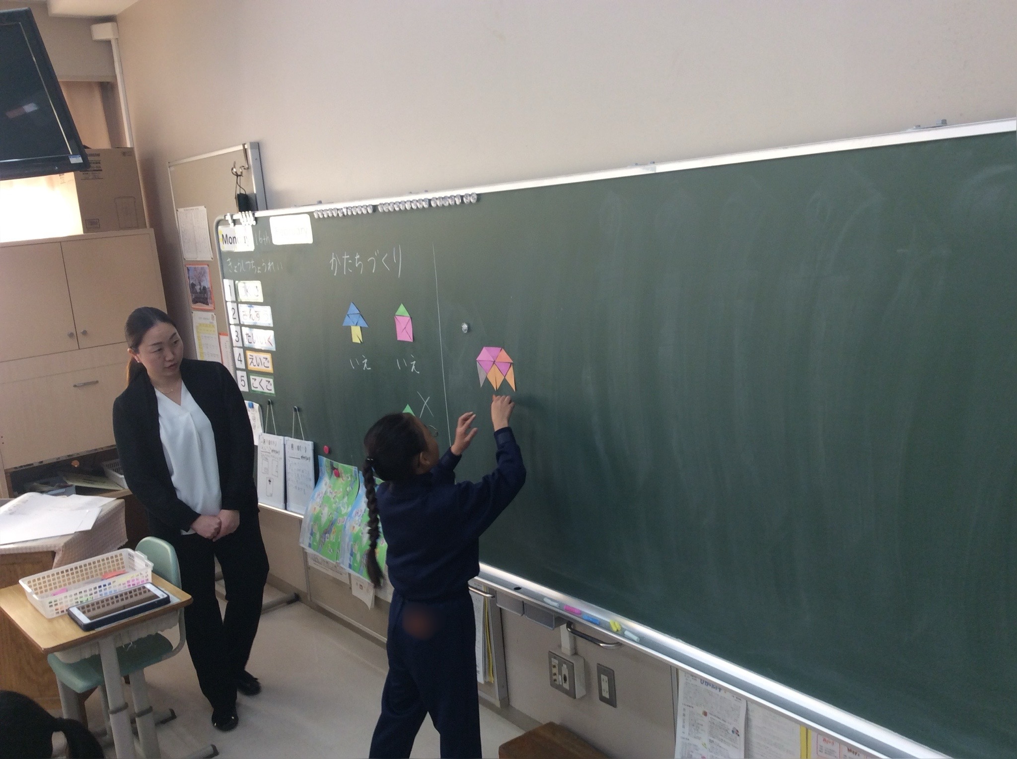 この日、1年B組の2時間目は少し賑やかで楽し気な空気に包まれていました。授業科目は算数。子どもたちが楽しんでいたのは、自分が切り取った三角の色板で、思い思いの形をすきなように作っていたのです。
