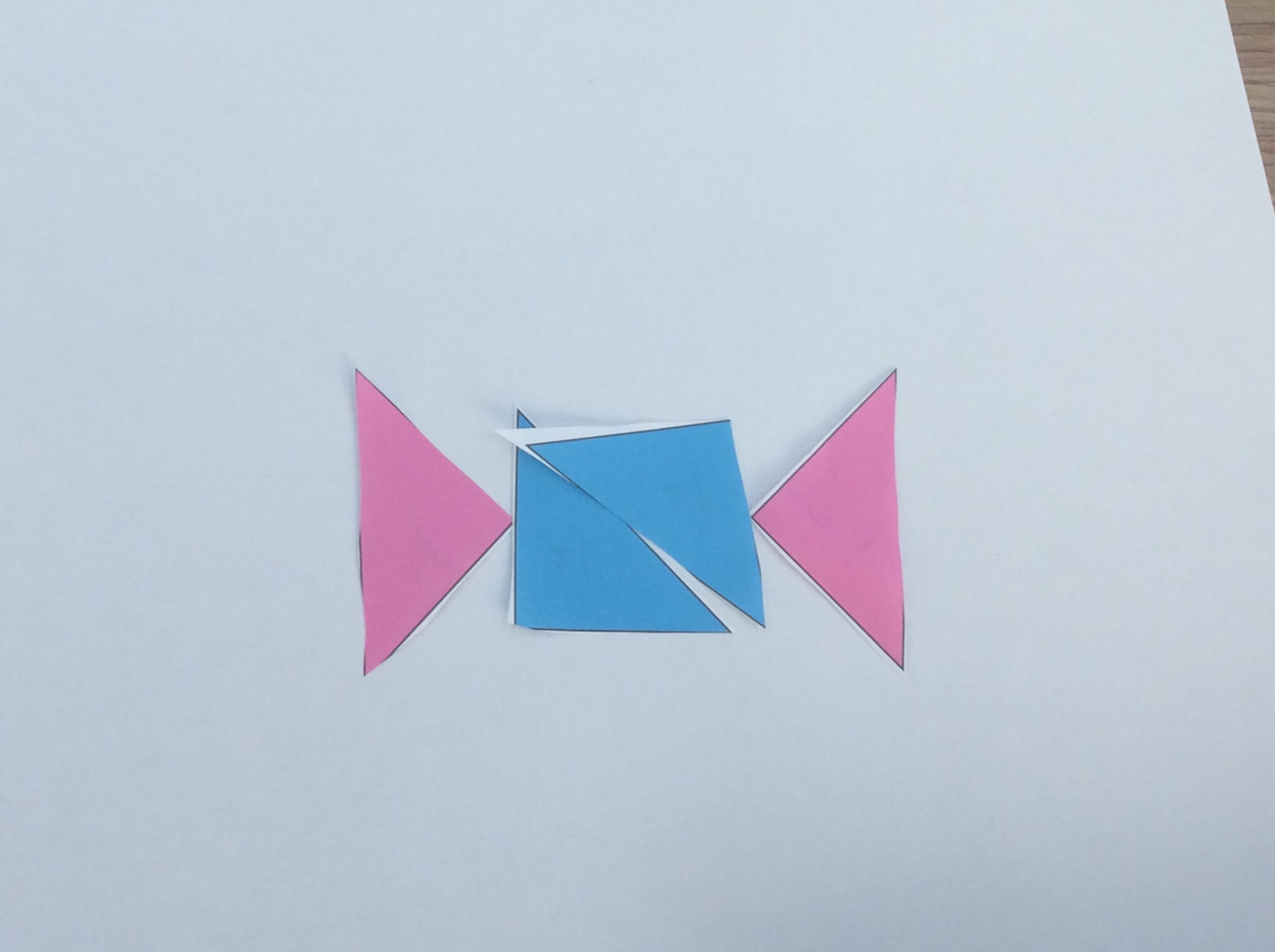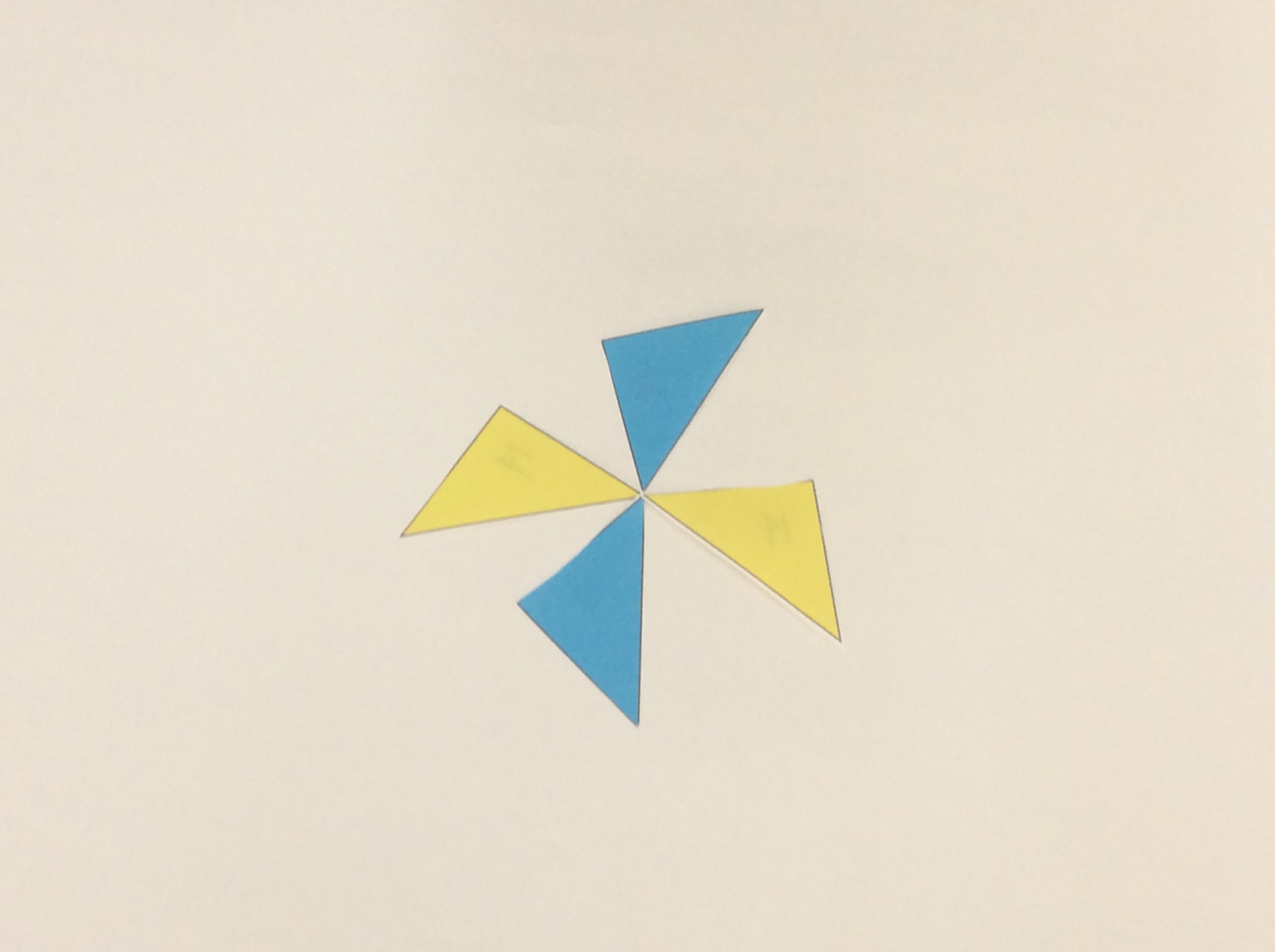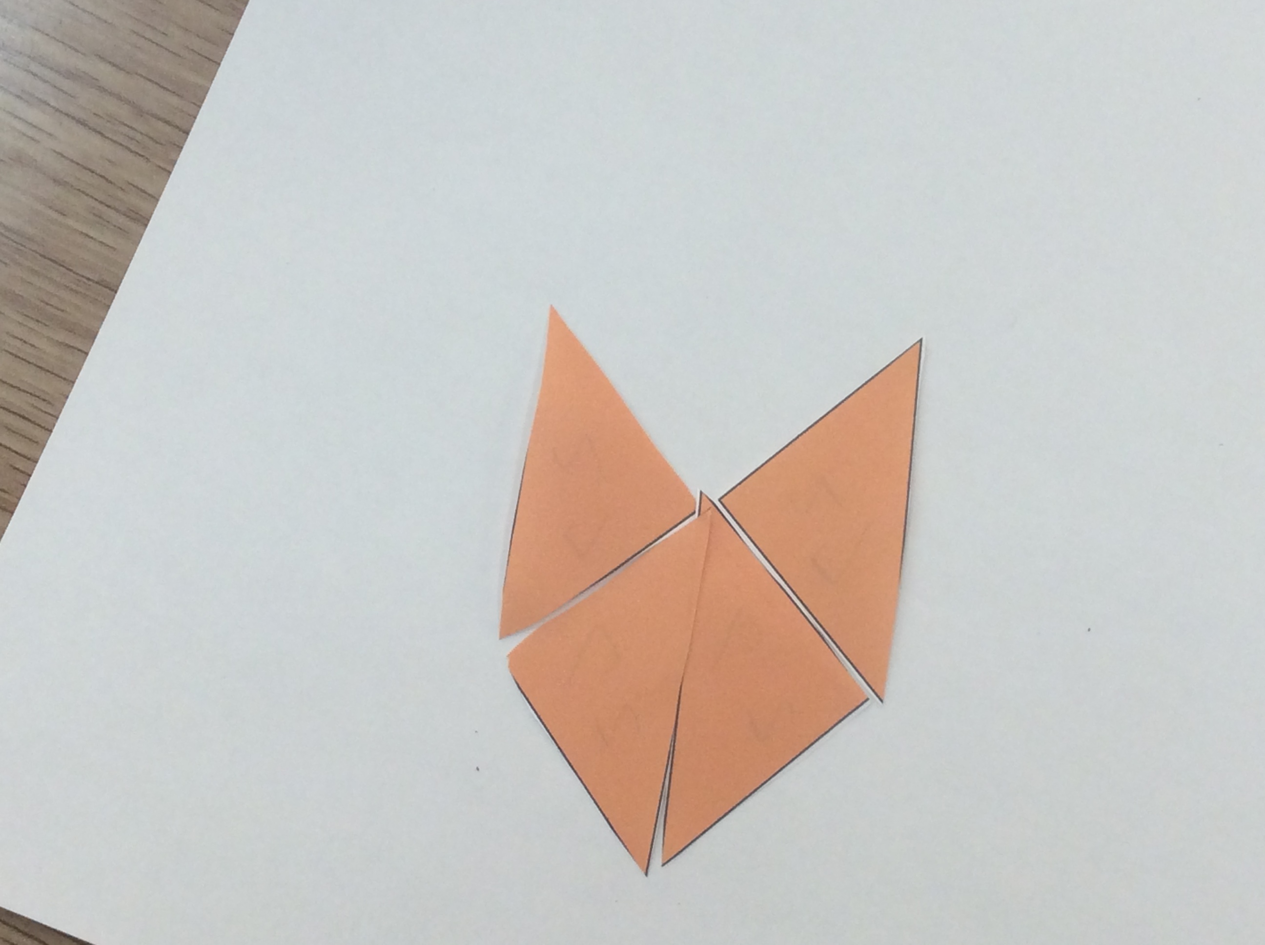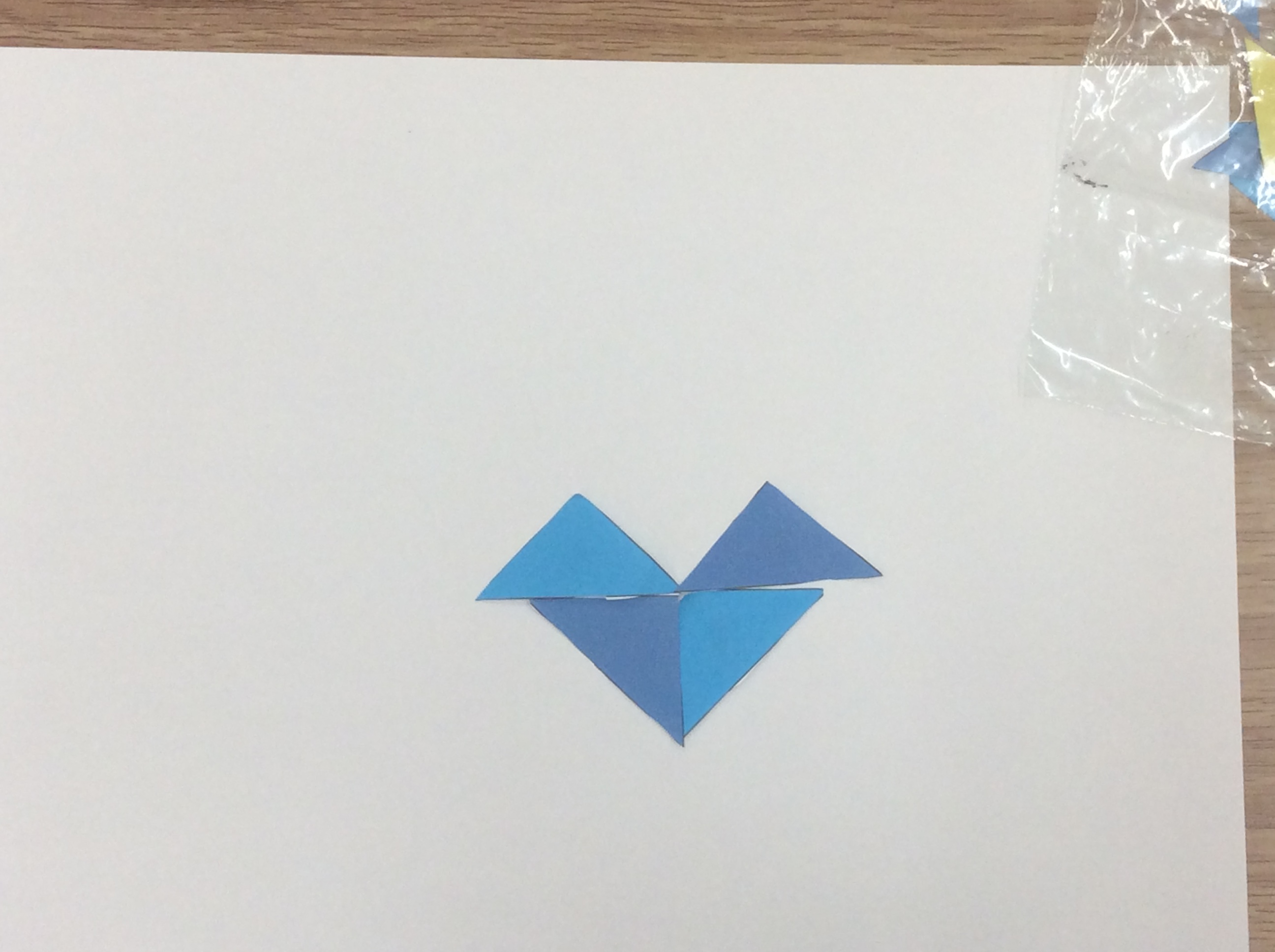 「あっ、じょうず!すぐにわかった!それさかなでしょ!」「せいかーい!」そんな会話が弾んでいて子どもたちは楽しそうに三角色板でいろいろな形を考えています。