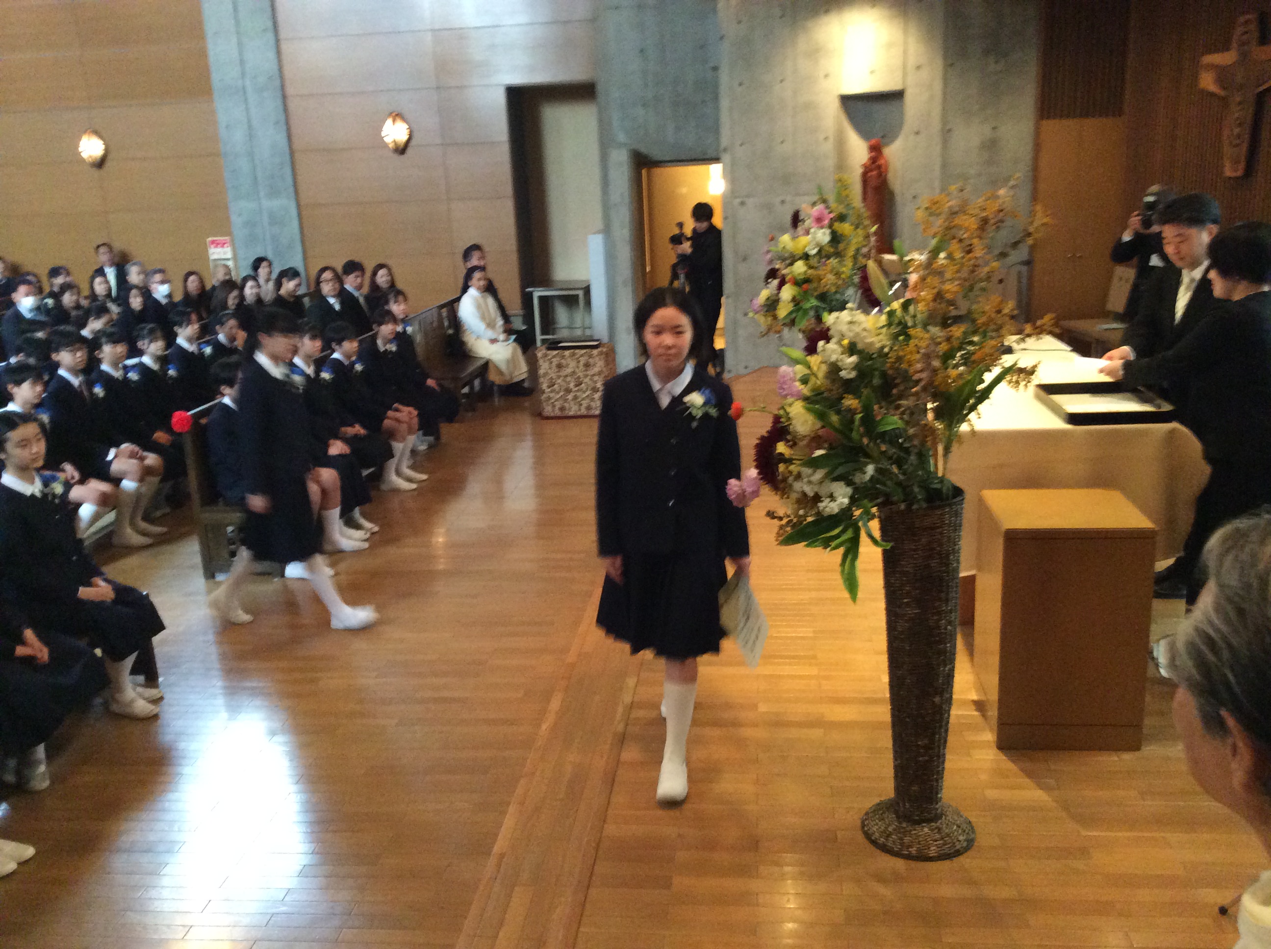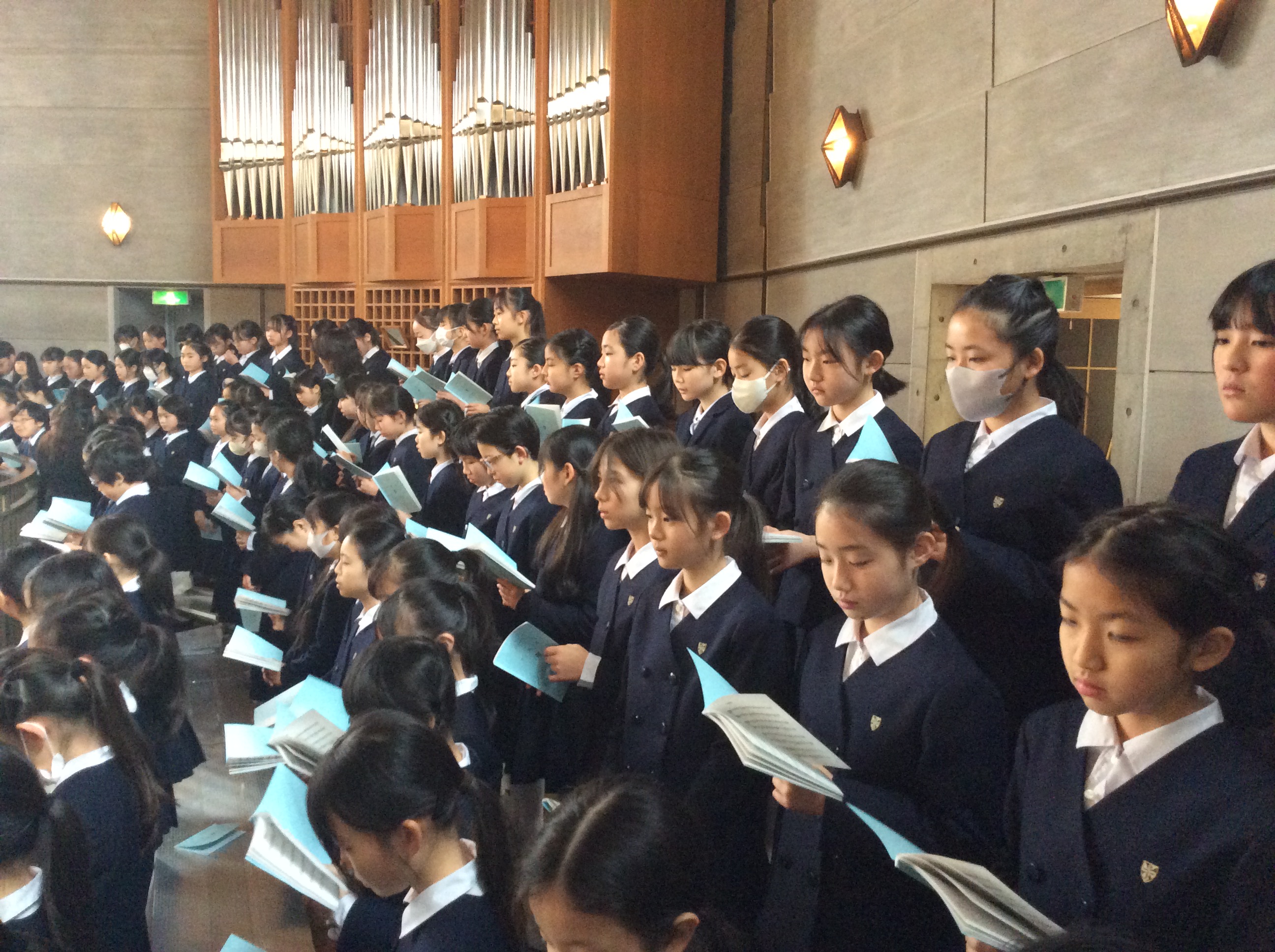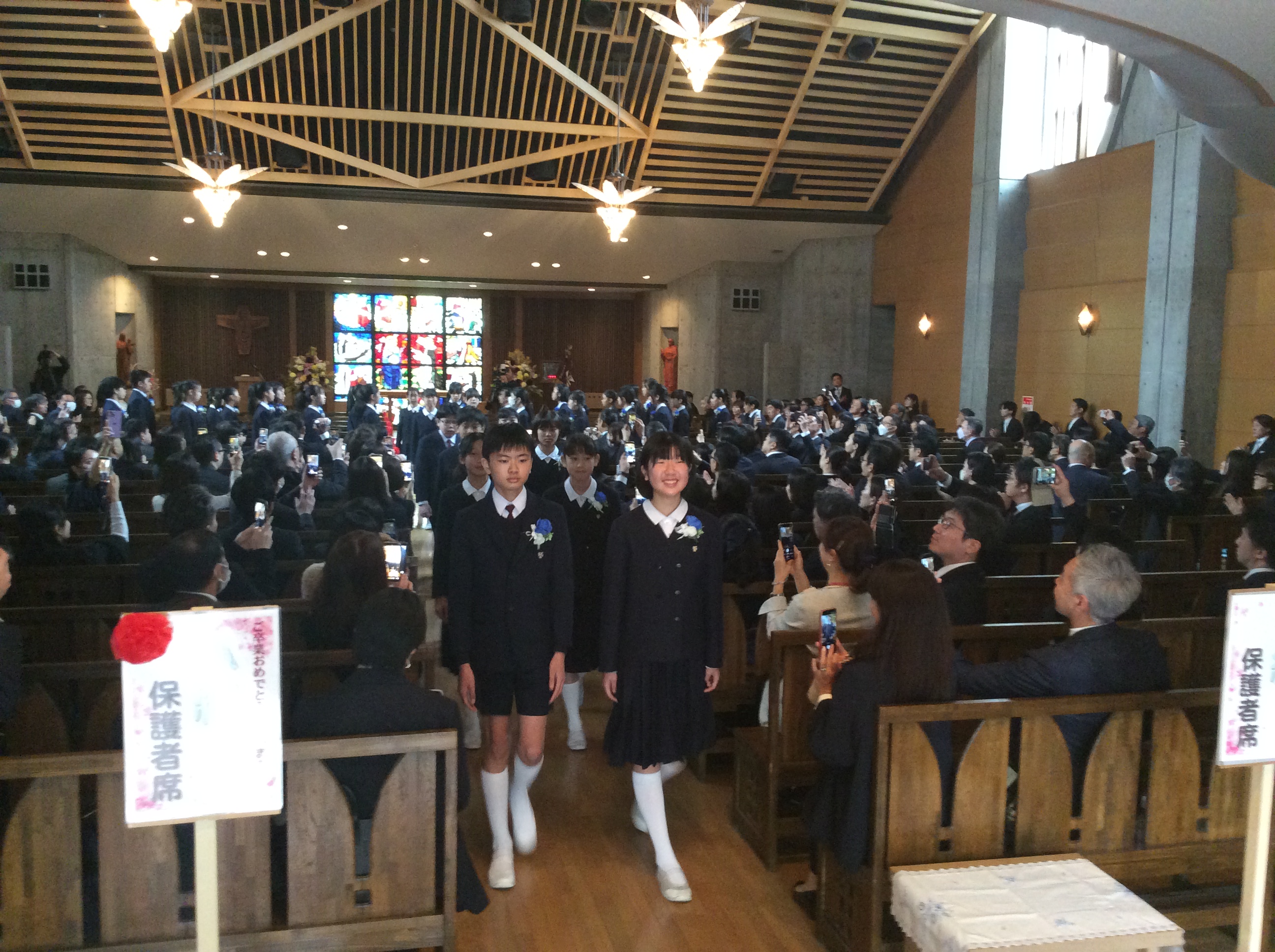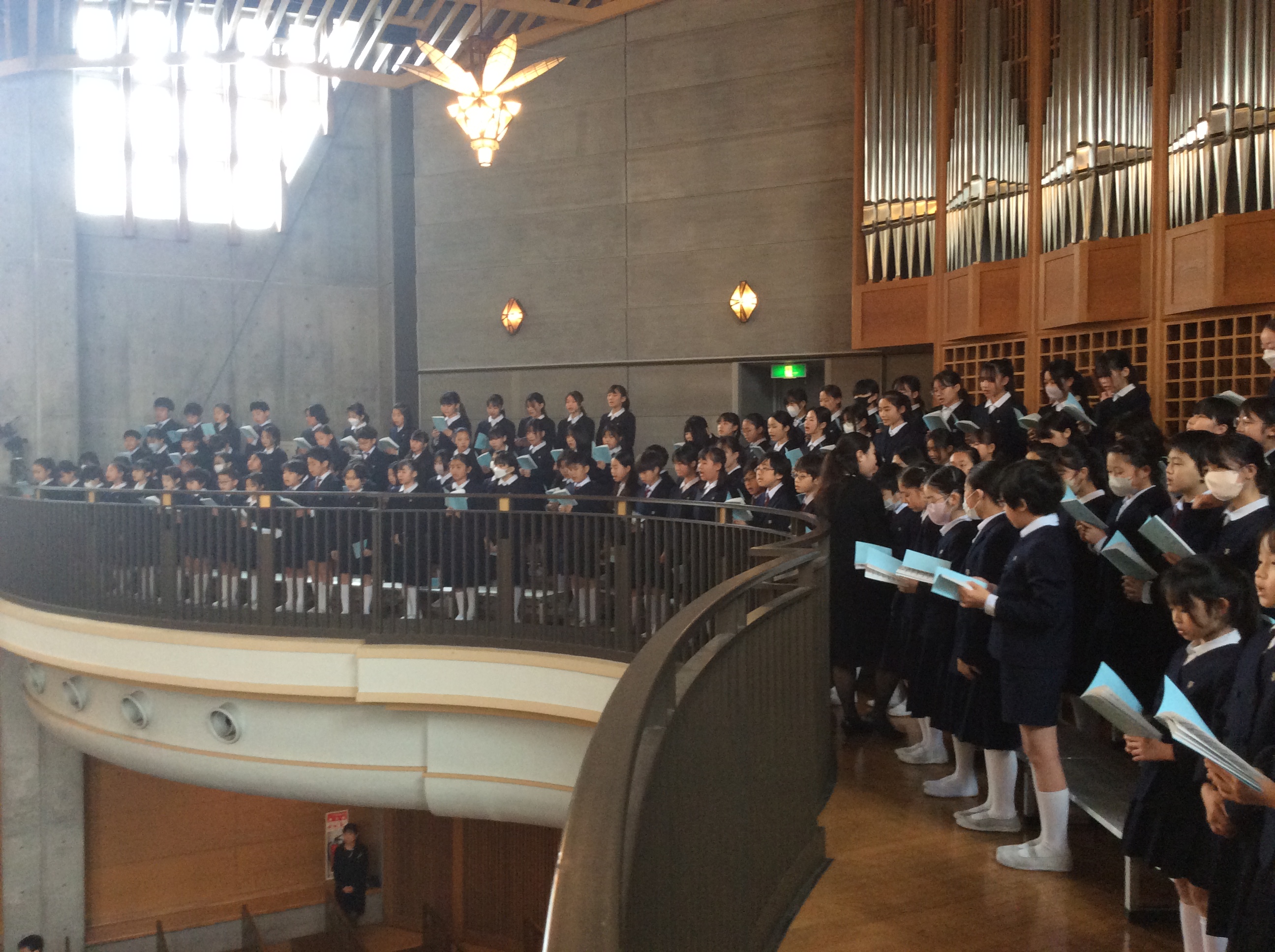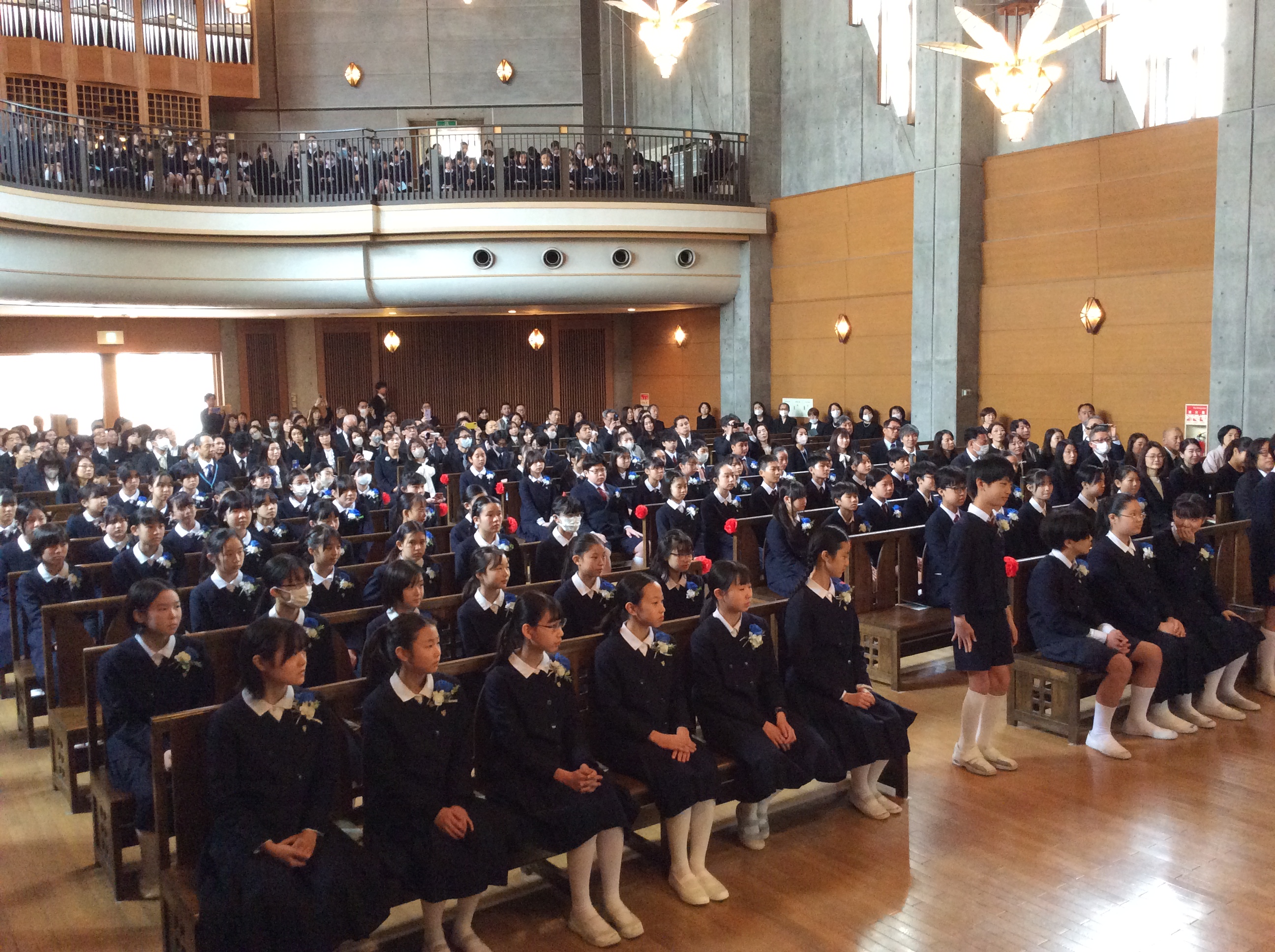 聖堂3階から下級生が歌う「ほたるのひかり」に降り注がれながら、込み上げる想いで胸がいっぱいになる6年生たちが静かに聖堂をあとにしました・・・