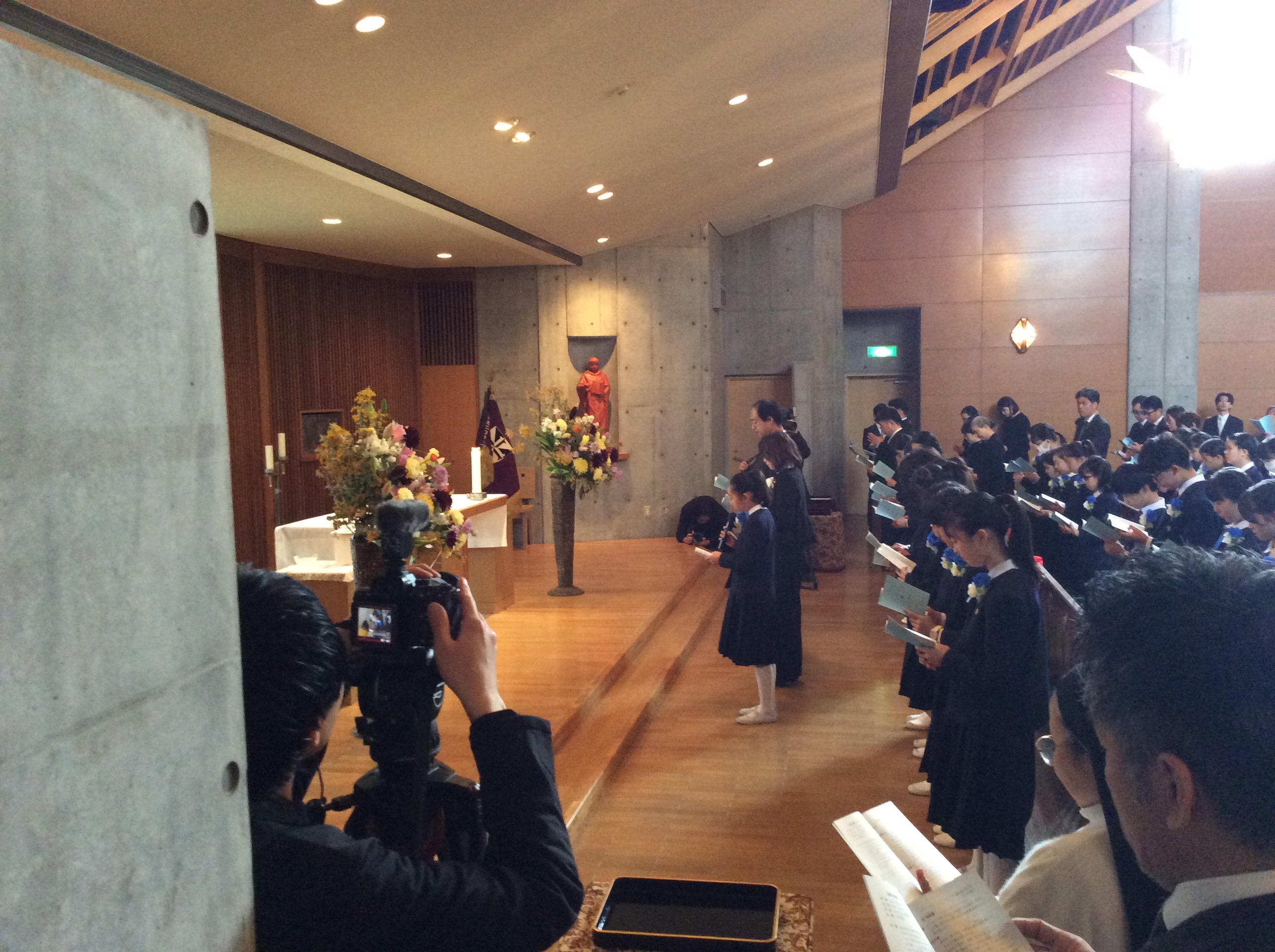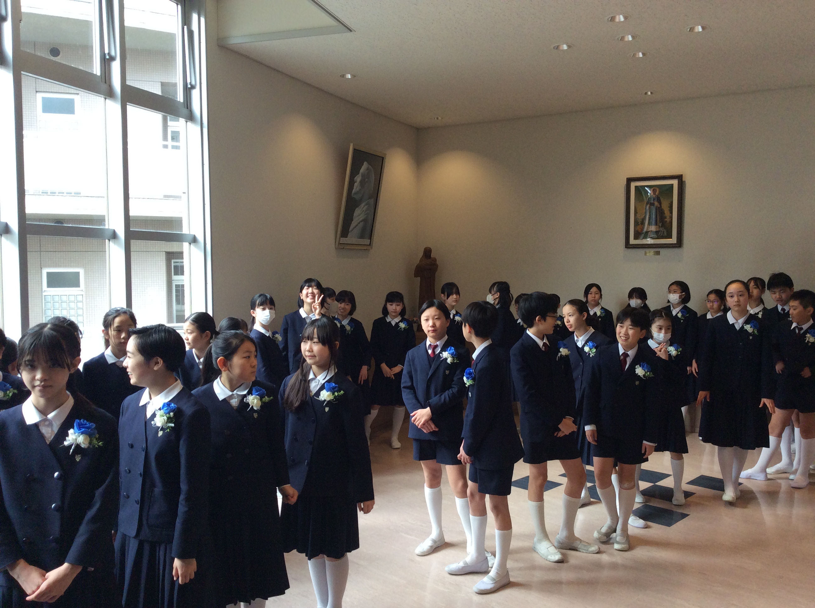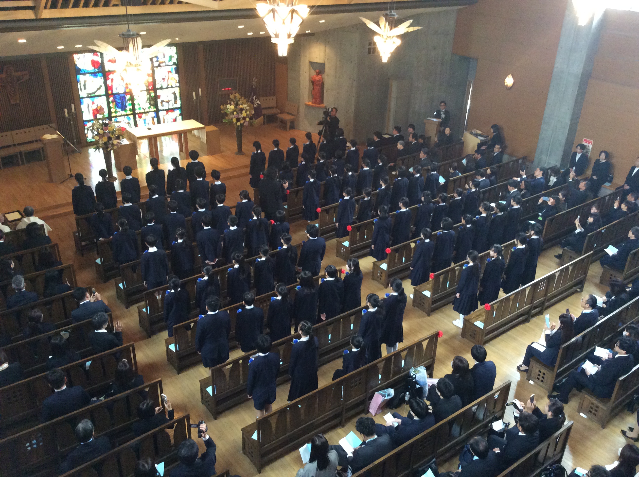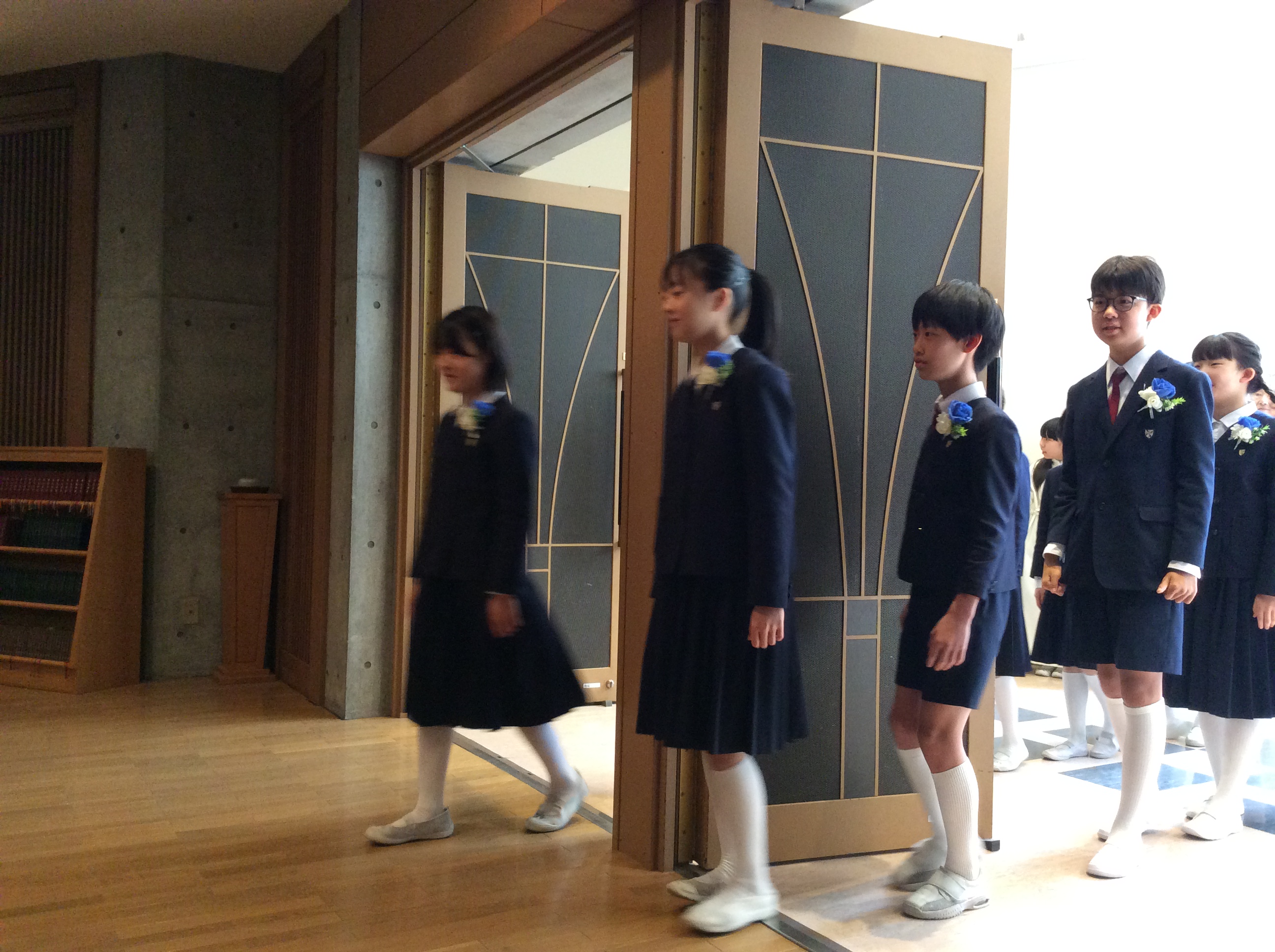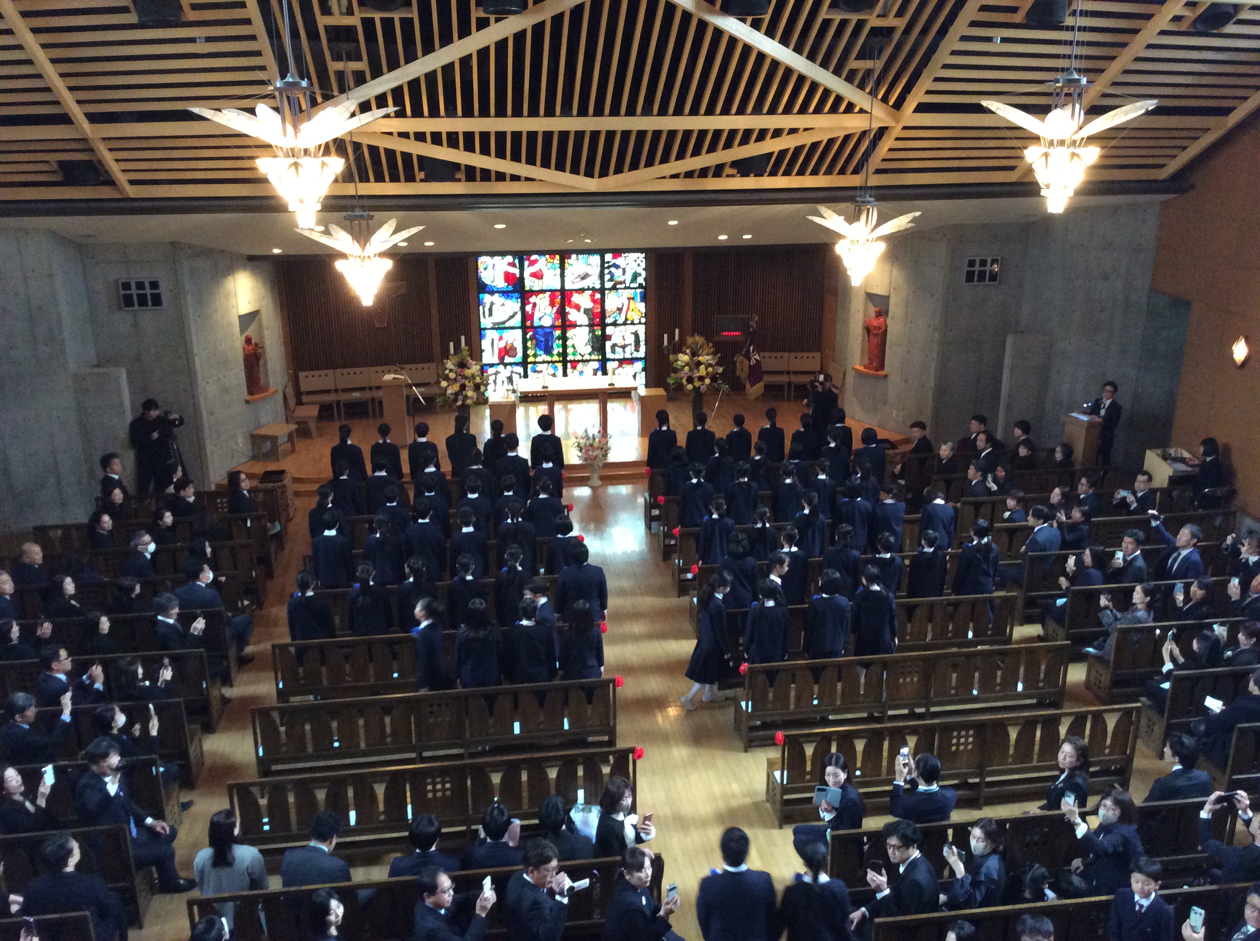 聖堂3階から下級生が歌う「ほたるのひかり」に降り注がれながら、込み上げる想いで胸がいっぱいになる6年生たちが静かに聖堂をあとにしました・・・