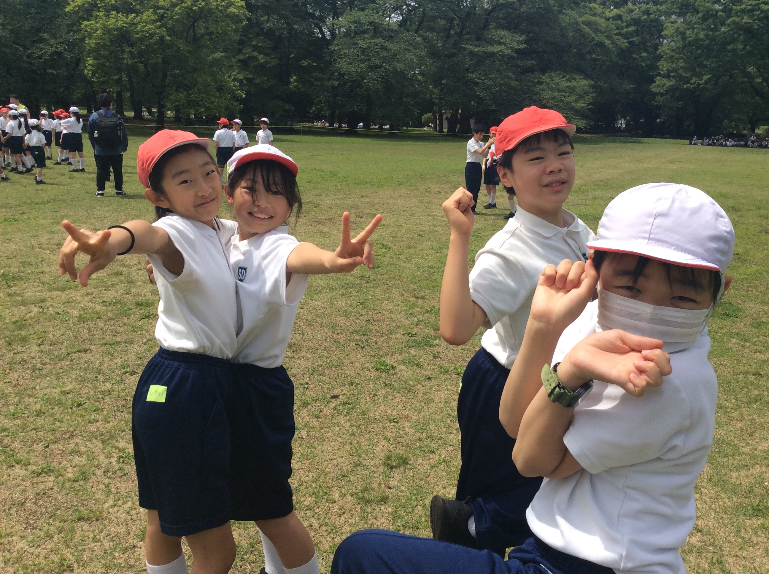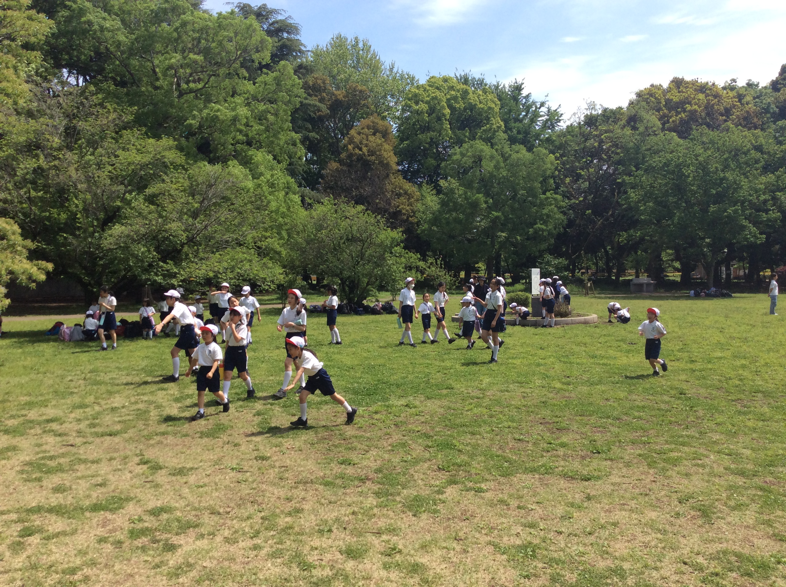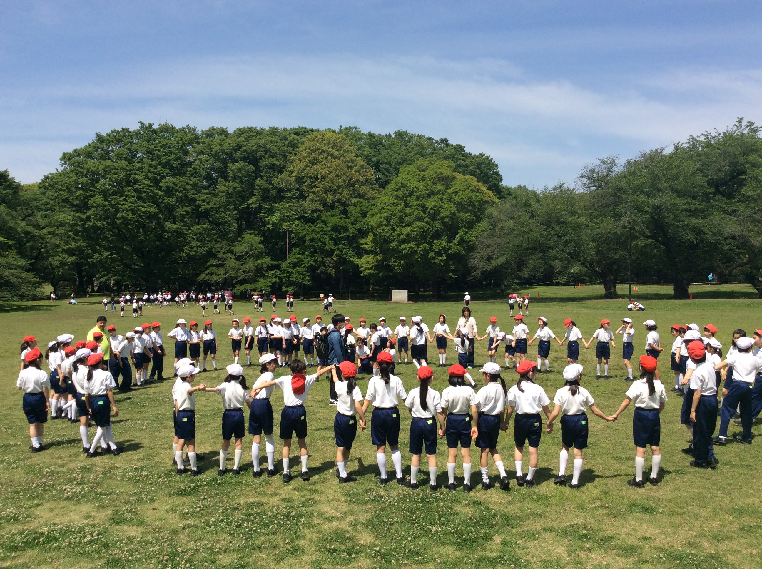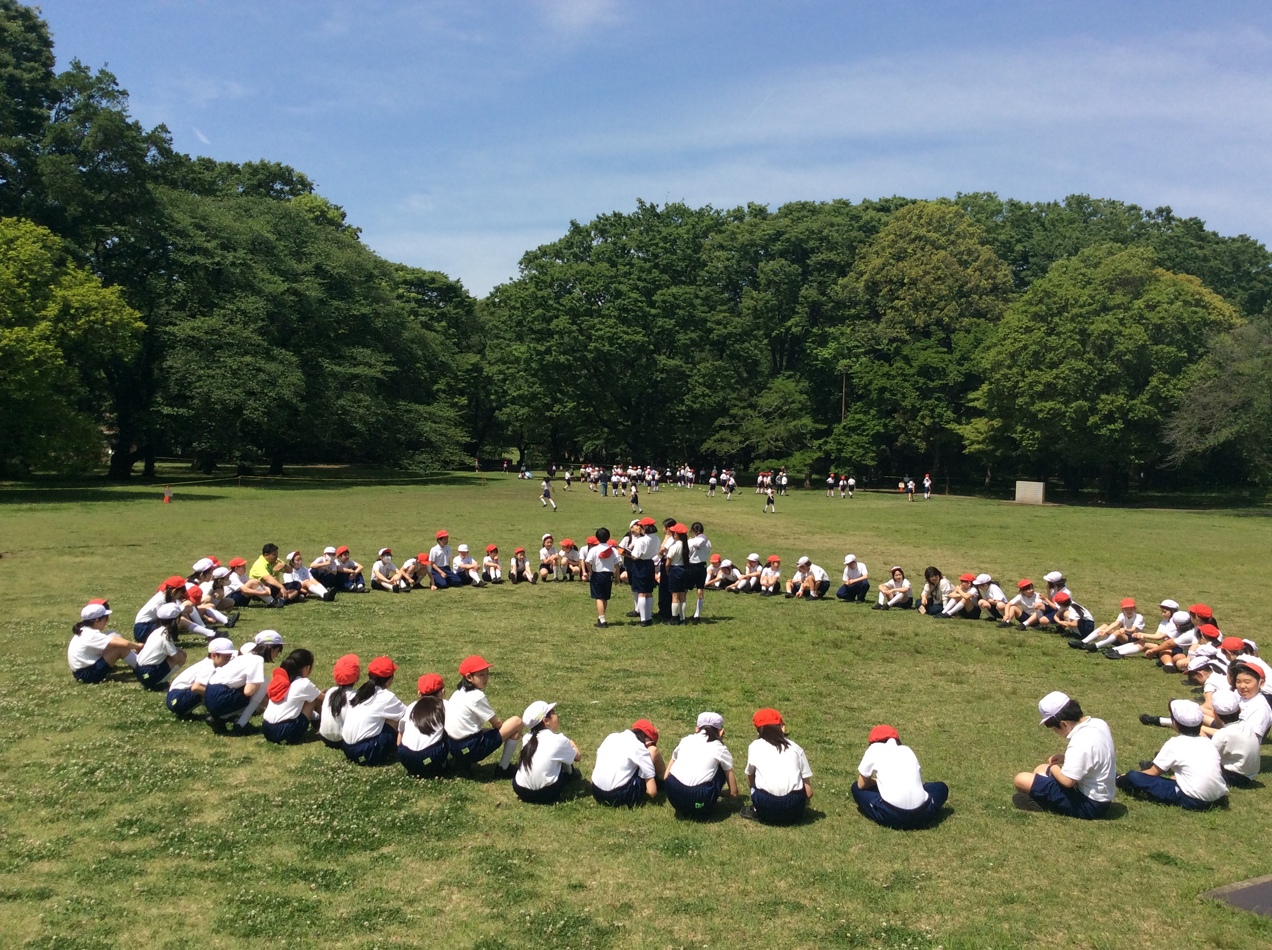 きれいな青空のもと、全校児童が砧公園へ繰り出しました。広いフィールドでおもいっきり遊ぶぞ!!