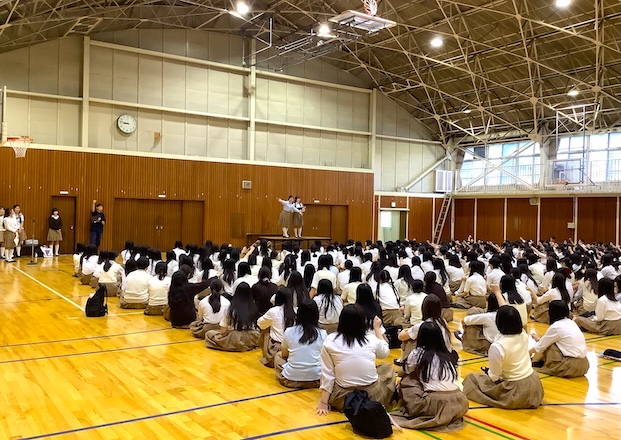 第2体育館での全校朝礼では、聖歌「ごらんよ空の鳥」を歌ったのち、学園祭の無事な開催に向けて全員で「主の祈り」「アヴェ・マリアの祈り」をお唱えしました。