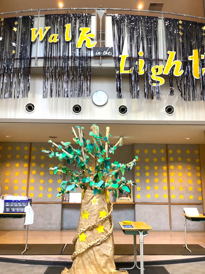 開会式終了後は各企画が最後の準備にとりかかりました。中高昇降口には大きなツリーが出現しました。このツリーは来場者のみなさんとともにこの2日間で作り上げていくものです。ツリー付近にある星形のカードに、自分の夢や希望をメッセージを書いていただけると、生徒会役員がツリーに飾っていきます。ぜひお立ち寄りください。