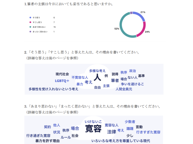 今年度は、「悪魔ちゃん」事件、平和学習の限界、「法律は人を幸せにするか」(尊属殺重罰規定判例を考える)、「多様性をめぐって」、「寛容と不寛容」、選択的夫婦別姓、などのトピックを取り上げました(下の写真は、「寛容と不寛容」に関するコメントを授業後にまとめたもの)。