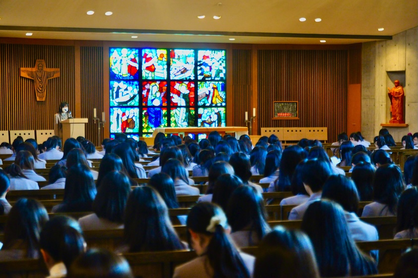 1月8日、聖堂にて3学期始業式を行いました。当日の朝は厳しい冷え込みでしたが、差し込む光や空調のおかげもあり、聖堂内は暖かくなっていました。