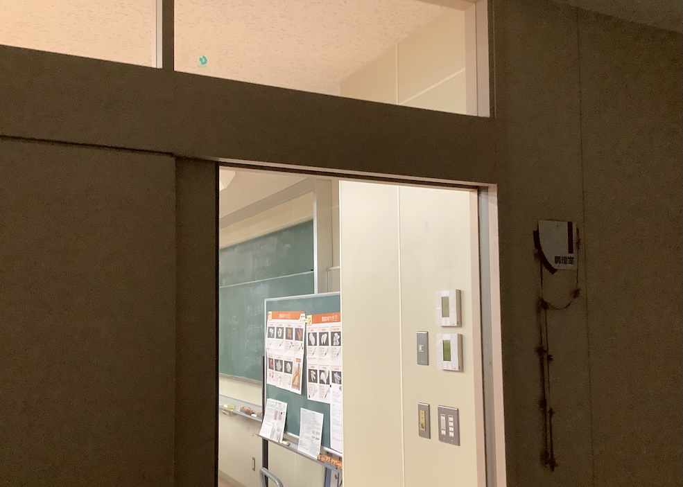 調理室です。室内では、家庭科の教員が調理実習の準備をしていました。