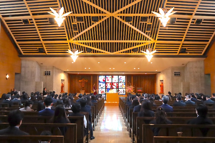 その後、午前11時より、聖堂にて高校入学式を行いました。高等学校における学びは、中学のそれよりもさらに「自ら選び取り、自ら学ぶ」ということが求められます。いっぽうで、自ら行動することの原動力は、中学校における3年間の日々のなかで培われているはずです。「あえて賢かれ(Sapere aude)」(カント『啓蒙とは何か』)との気持ちを胸に、たえず挑戦し続けることの楽しさを味わってほしいと思います(ちなみにSapere audeは高校1年生の学年通信のタイトルでもあります)。