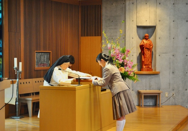 午後には、聖堂にて中学入学式を行いました。誂えたばかりの制服に身を包んだ新入生の皆さんは、校長先生からの「ご入学おめでとうございます」という言葉に「ありがとうございます」と明るく返答していました。