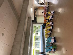 98日月曜日、防災訓練を行いました。今回はお外遊び中に地震が起きたらどうするかという訓練です。熱中症警戒アラートが出ていたために、5分ほど遊び、すぐに地震音を園庭に鳴らしました。事前に外で起きたらどうするか、各クラスでも話していたこともあり、子どもたちは落ち着いて、近くにいる教師の指示に従い、安全な木の下に行き、頭を守るポーズで小さくなって集まることができました。園庭の高所、例えばジャングルジムやアスレチックの上にいる子どもたちには、慌てて飛び降りることのないように、教師が近くに行き下りることができました。本来ならば園庭に集まるところ、ピロティーにクラスごと整列し、人数確認まで順調に行うことができ、園長先生からも今日の訓練のように、本当に起きた場合にも落ち着いて行動しましょうと伝えられました。短時間での訓練となりましたが、とても大切な経験となりました。ご家庭でも防災の備えをさらに進めていただくきっかけとなりましたら幸いです。