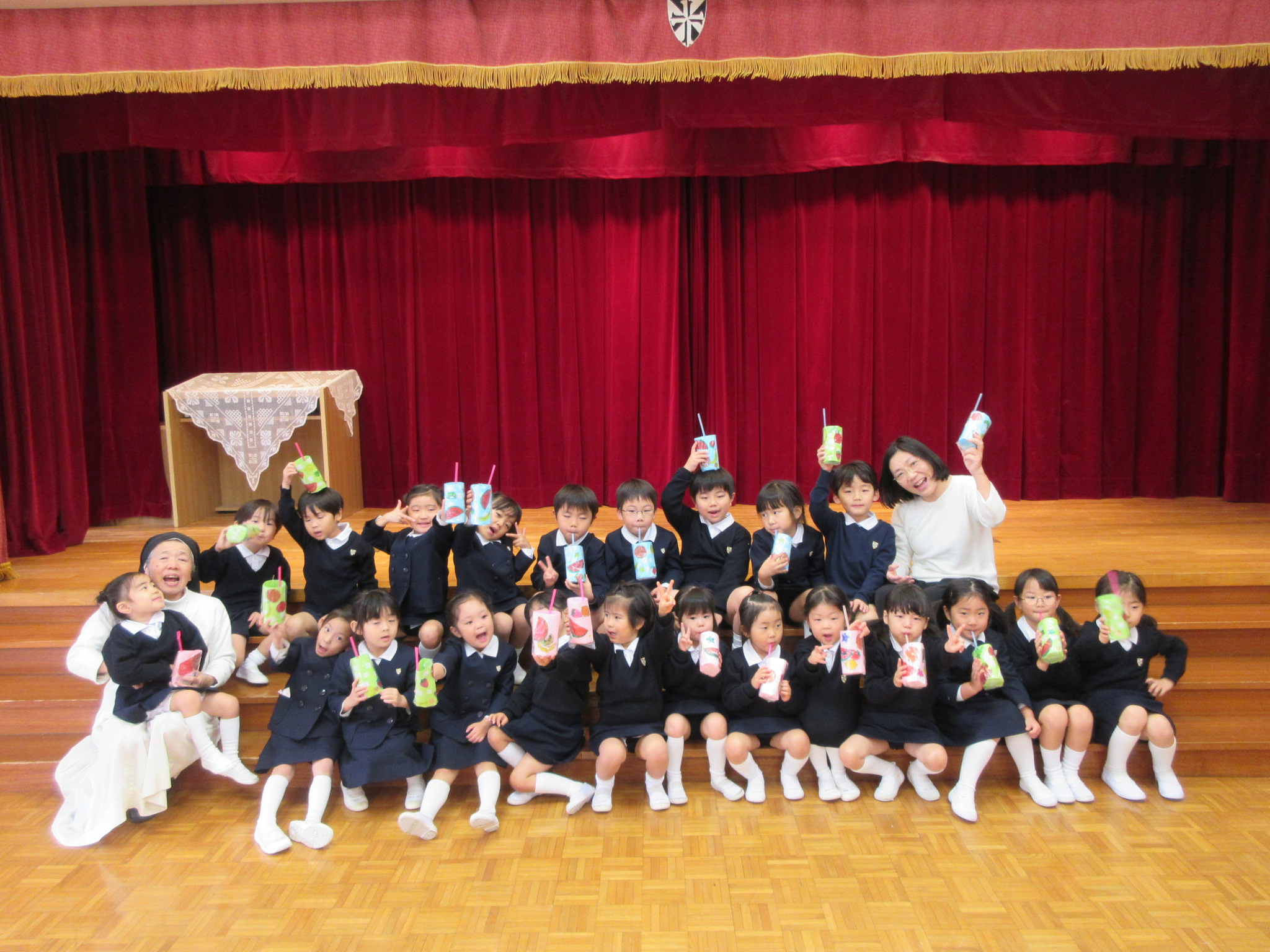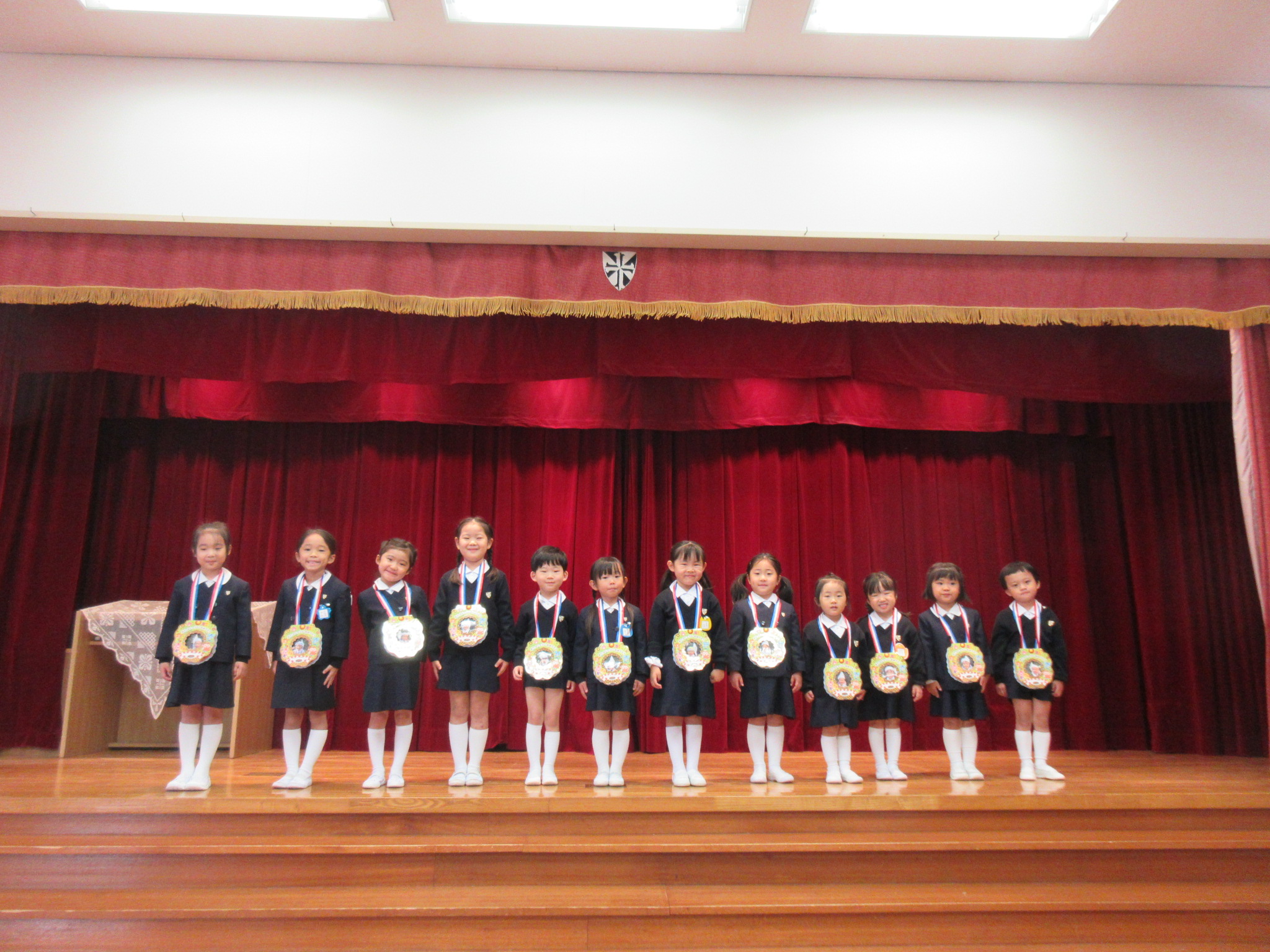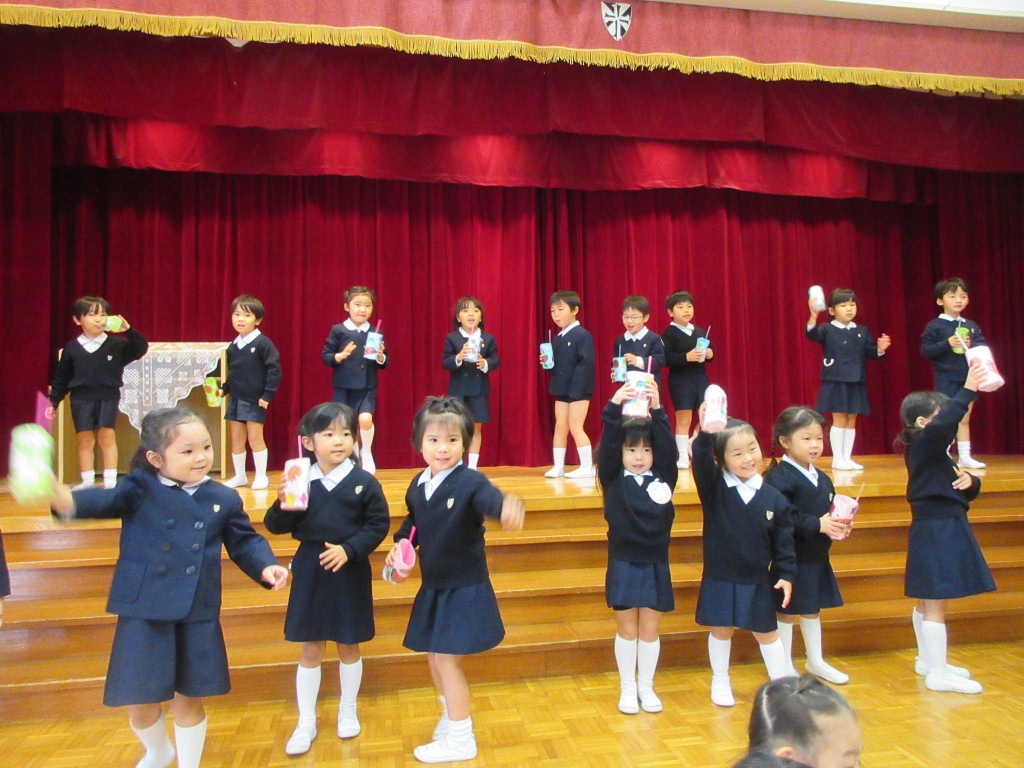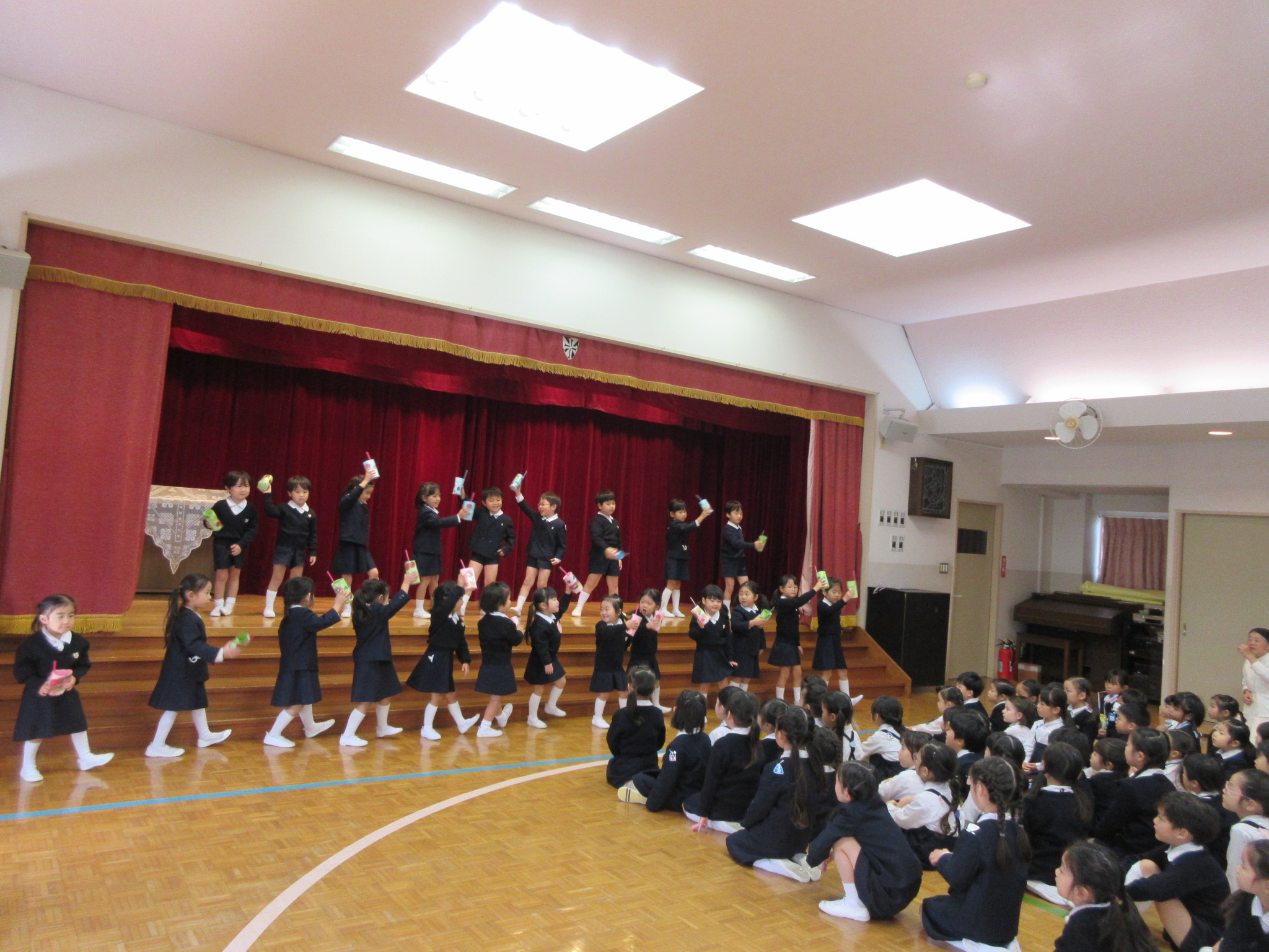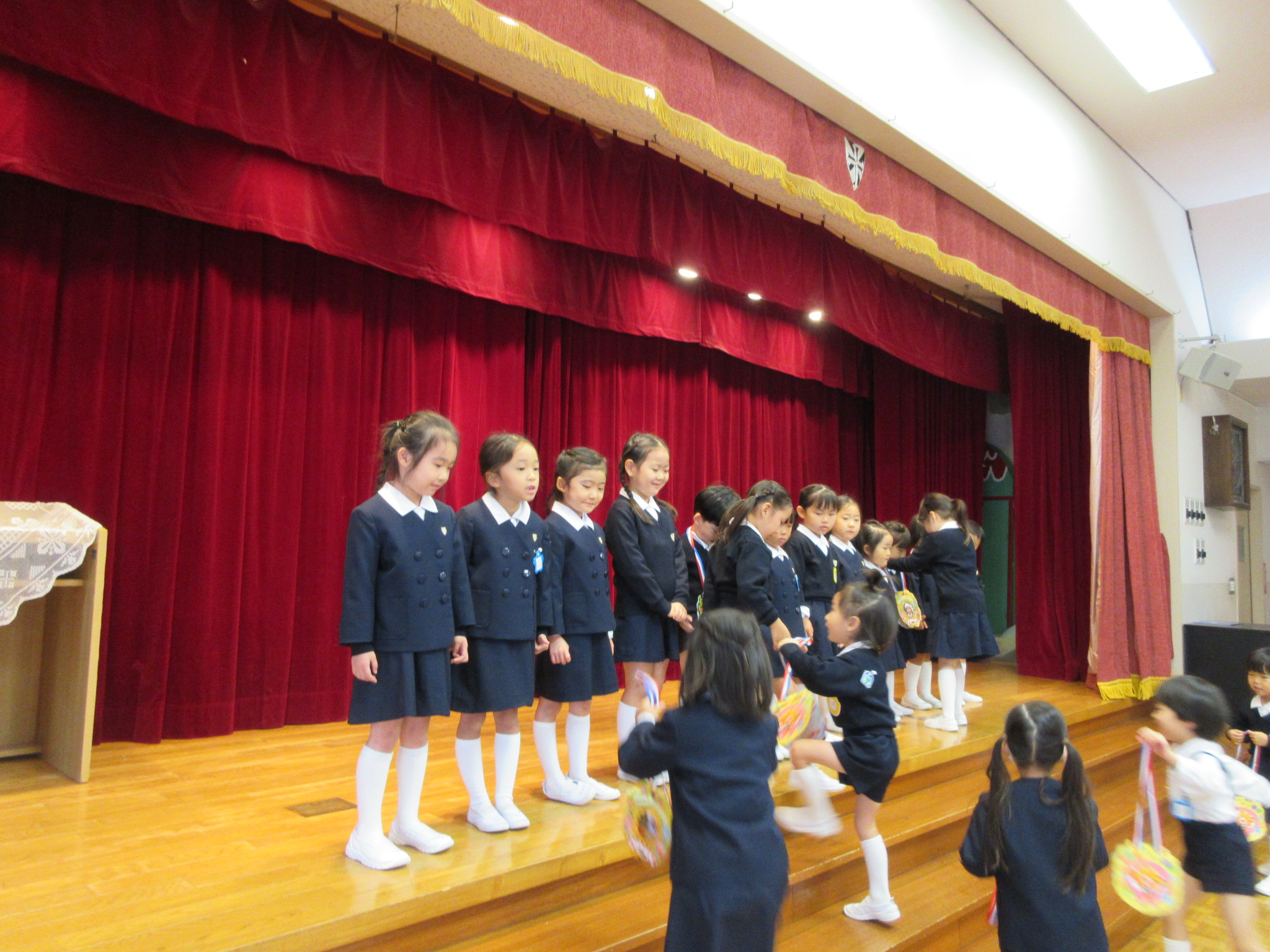 みんなでホールに揃ってお祈りと朝のご挨拶をした後、園長先生から「すすんで「よいこと」をしましょう。」というお話を聞きました。その後、11月生まれのお友達を一人ずつ紹介してステージに上がっていただき、拍手と歓声の中、「お誕生日おめでとうございます!」とお祝いをしました。