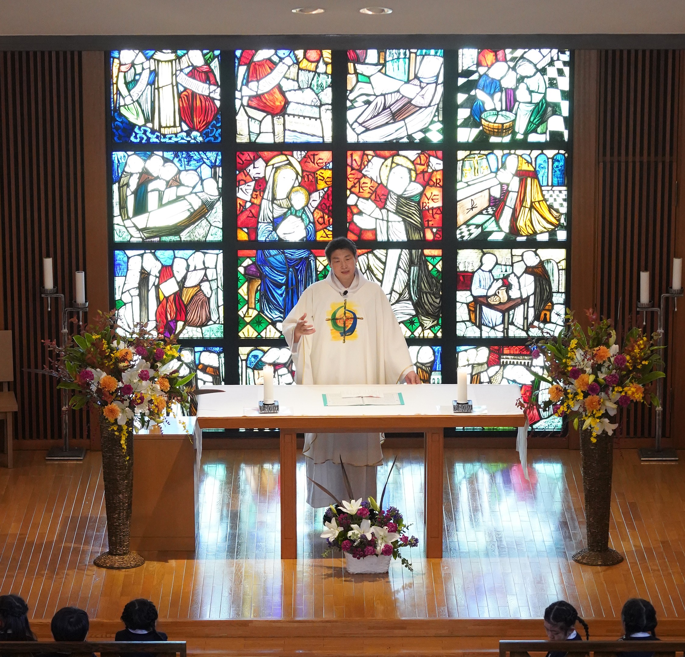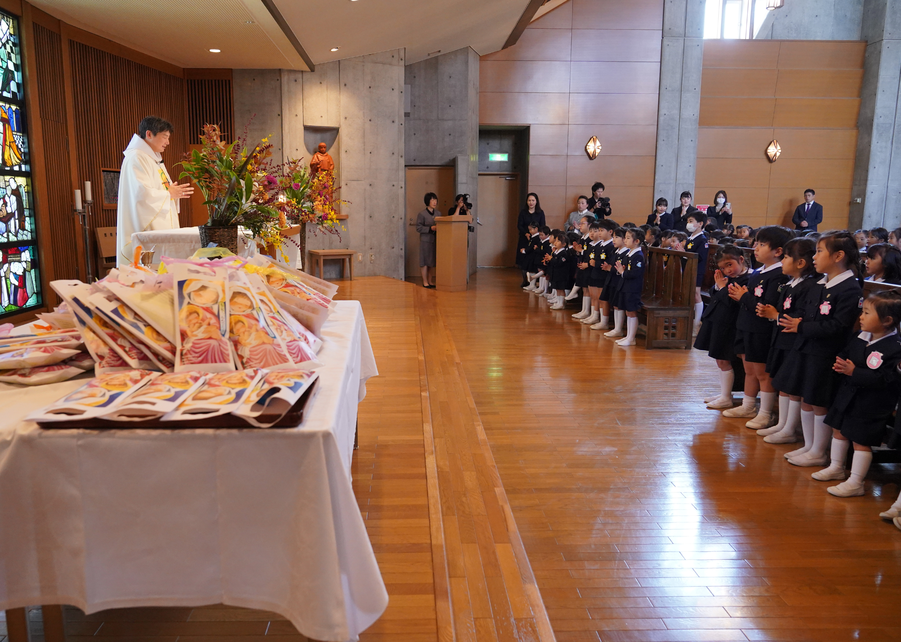 司式をしてくださった元田神父様から、「七五三とは、子どもが3歳・5歳・7歳になったとき、その成長を祝い、健康を祈る行事である。昔は子どもの生存率が低かったこともあり、成長の節目にこれまでの子どもの無事を感謝する日である」というお話をいただきました。子どもたちは真剣にお話を聞き大きな声で聖歌を歌いお祈りしました。お祈りの最後に、ひとりひとりを祝福していただきました。