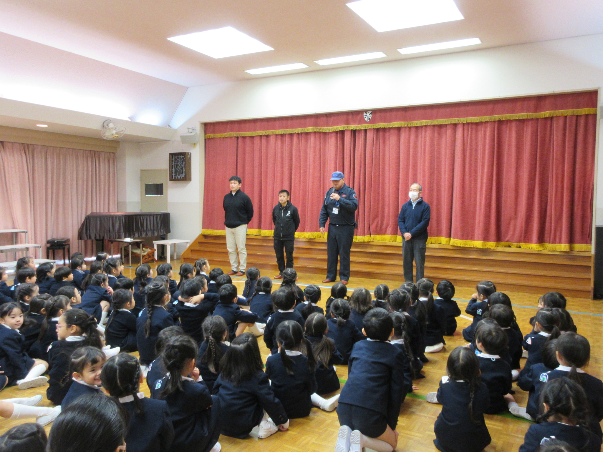 11月13日木曜日、勤労感謝の集いをホールにて行いました。日頃、学園の中でお世話になっている事務局の方々、環境整備の方、警備の方に幼稚園にいらしていただきました。いつもお世話になっている方へ感謝の気持ちを表し、手作りの心のこもったプレゼントをお渡ししました。スクールバスを利用している園児は、登園時、折り紙のブーケを運転手さんに直接お渡ししました。みんなが毎日安心して幼稚園に通えるのは、おうちの方をはじめ、たくさんの方に支えられていることを知る良い機会となりました。
